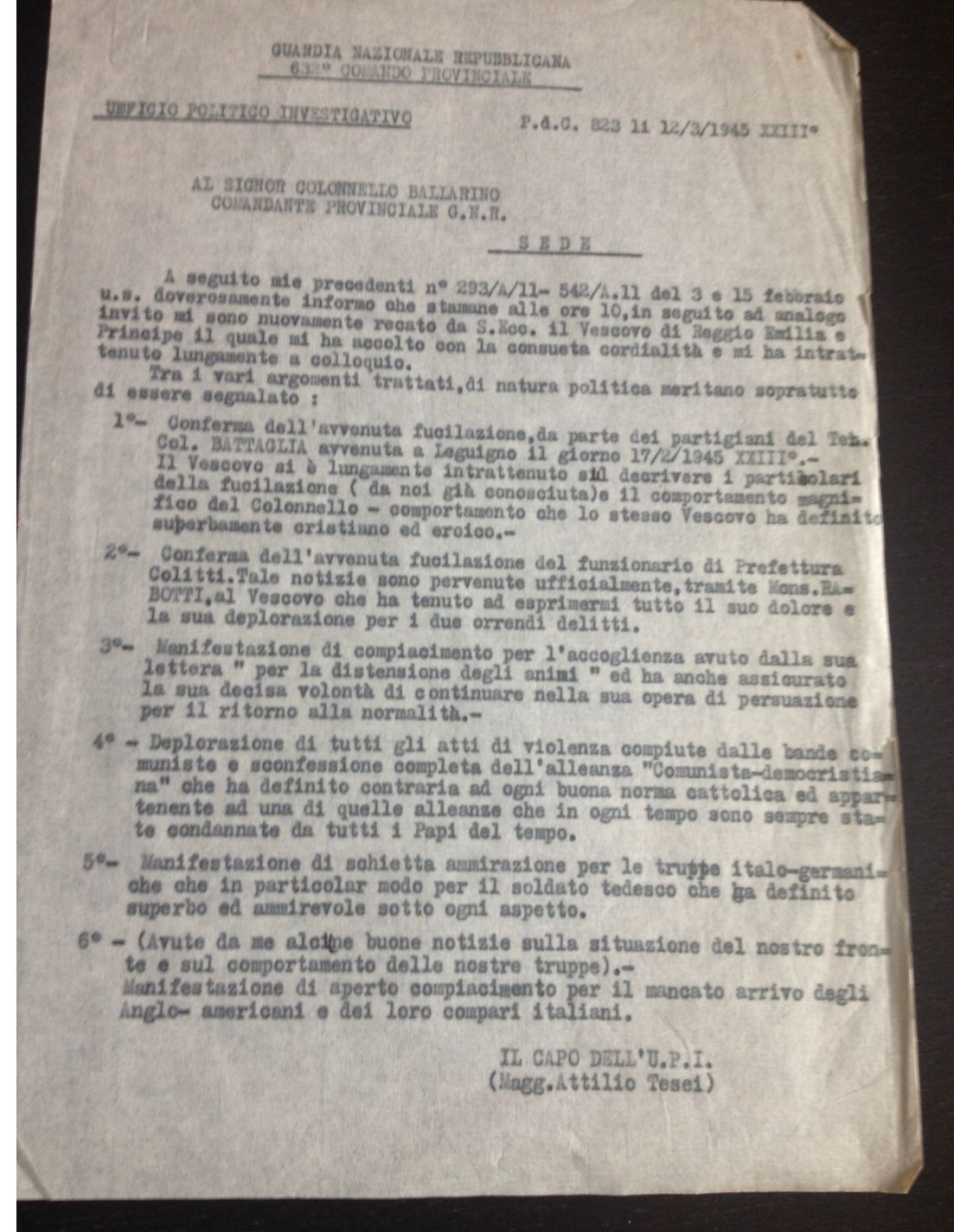 Reggio Emilia, 12 Febbraio 1945, il Maggiore Attilio Tesei, Capo Ufficio Politico Investigativo, l’unità più direttamente impegnata nella lotta ai partigiani, si reca dal Vescovo di Reggio Emilia Mons. Brettoni e dell’incontro redige una precisa relazione in 6 punti per il Comandante Provinciale, Colonnello Anselmo Ballarino.