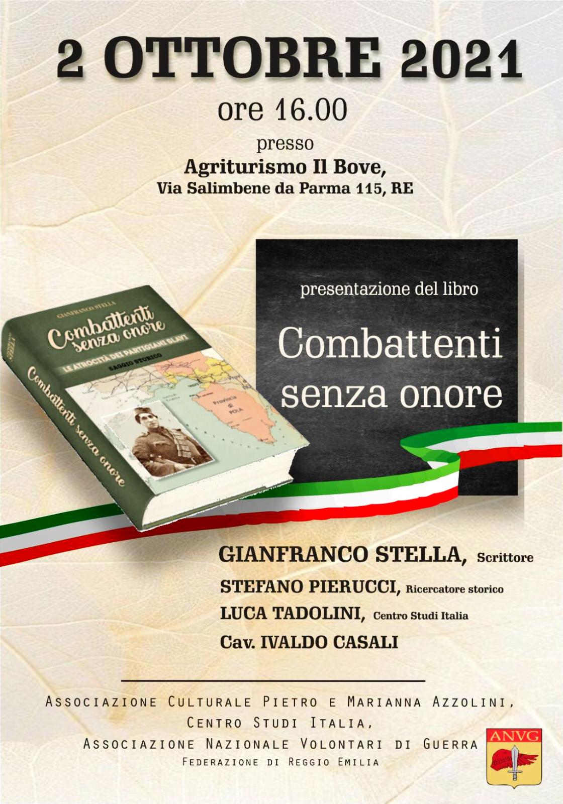 Il 2 Ottobre alle ore 16.00 presso Agriturismo il Bove, Presentazionhe del libro “Combattenti senza onore” go Gianfranco Stella autore, saranno presenti Stefano Pierucci (ricercatore storico), L’avv. Luca Tadolini del centro studi Italia e il Cav. Ivaldo Casali.